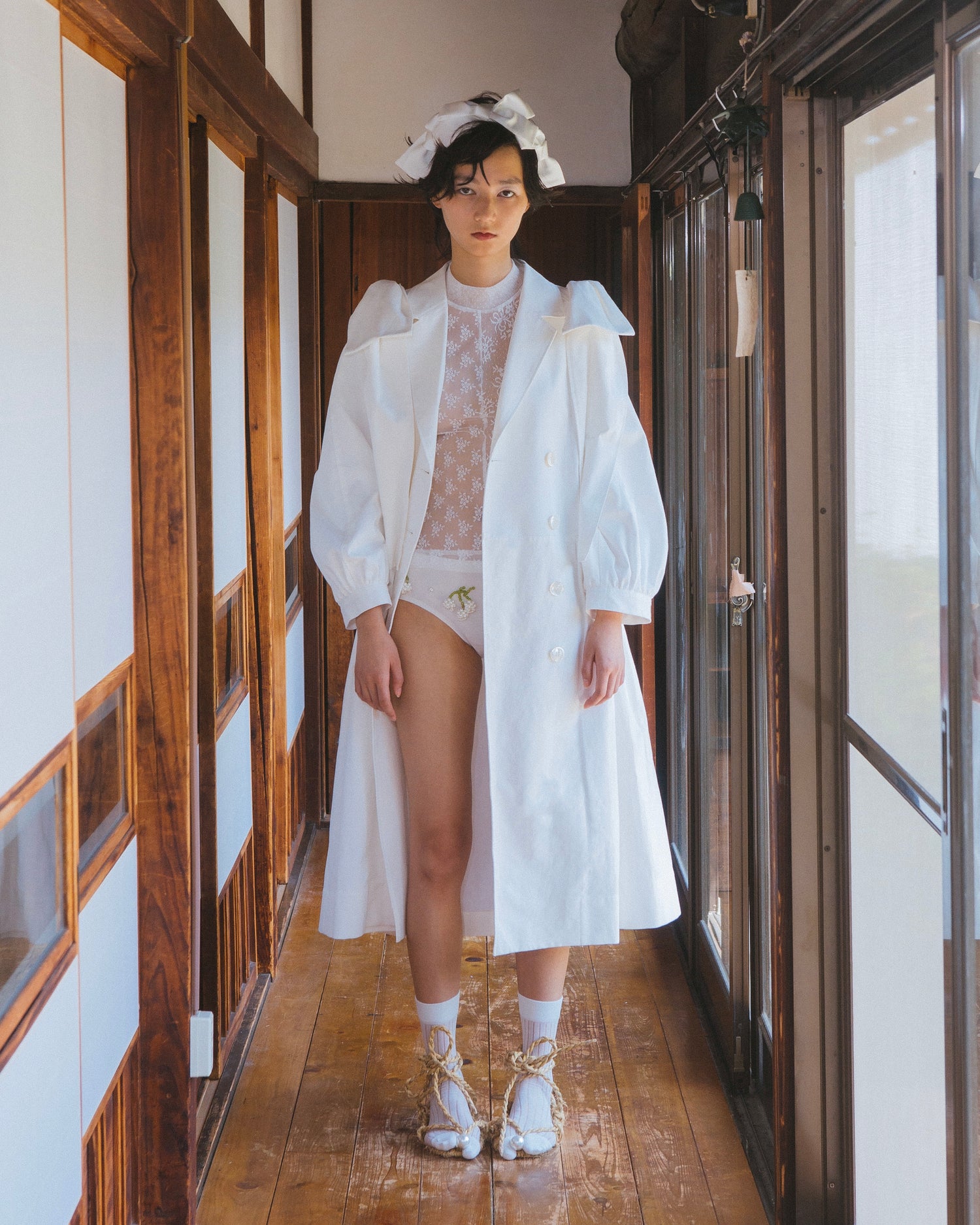 ボリュームたっぷりのパフスリーブとシルエットがポイントのホワイトトレンチコート。肩にはビッグリボンの装飾。