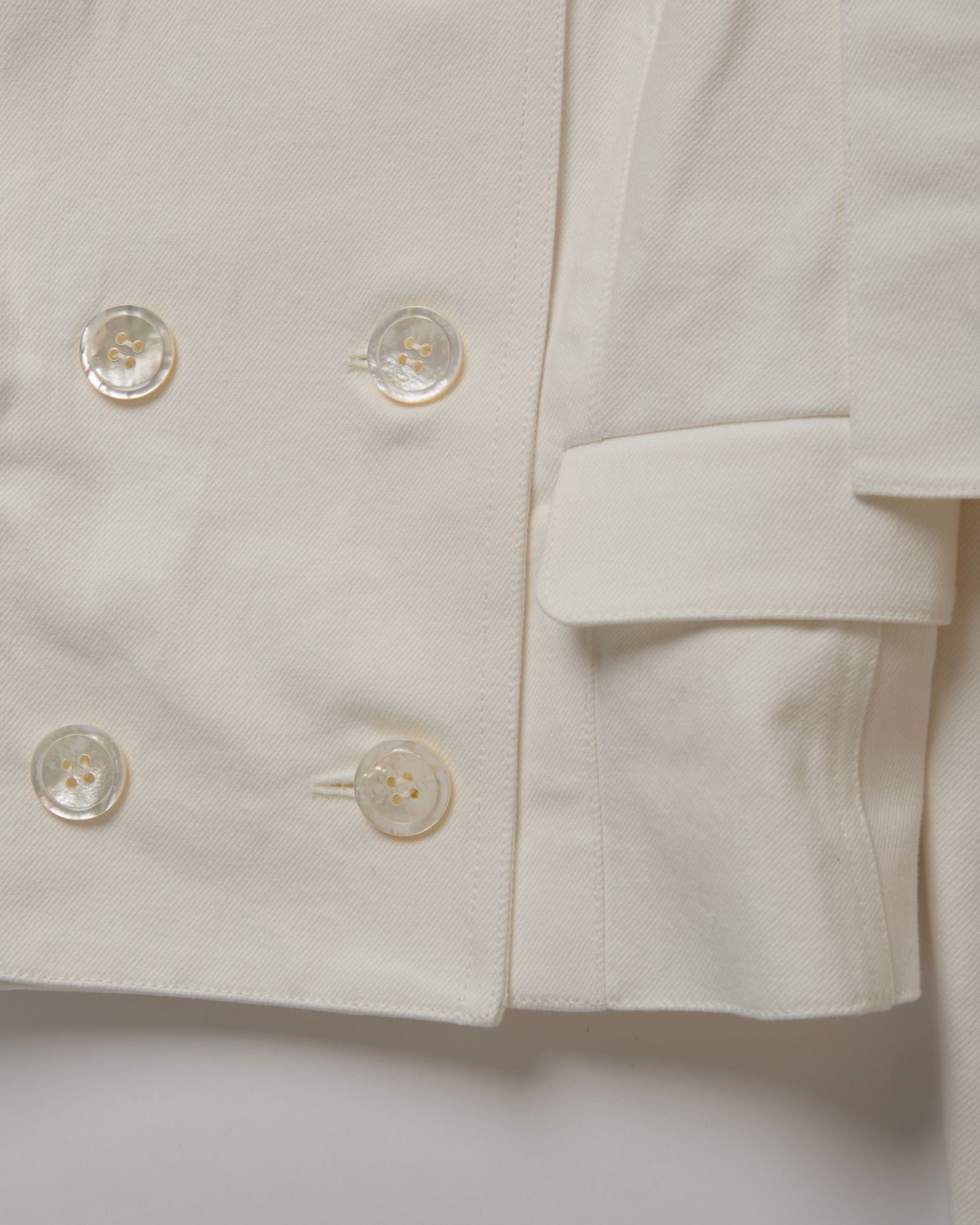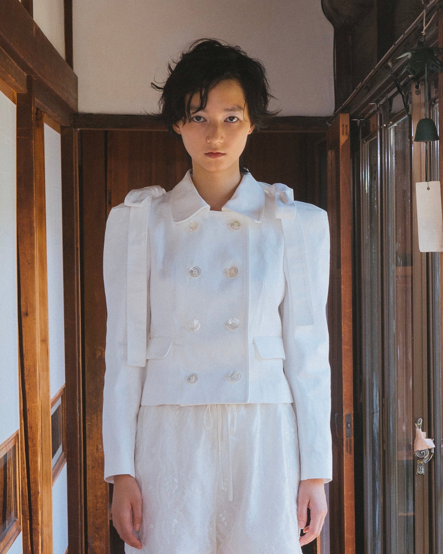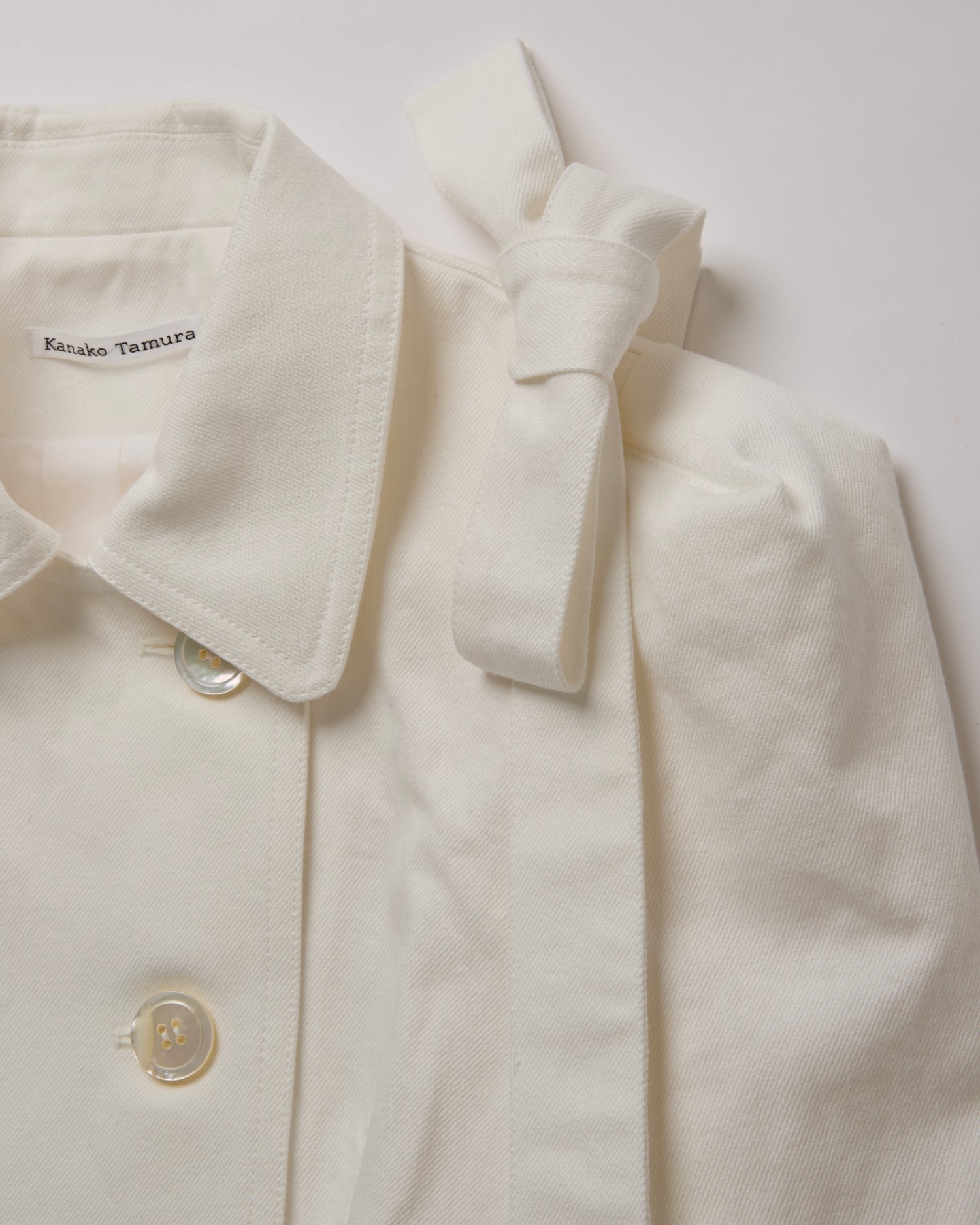 スクエア型の袖がポイントのホワイトデニムのジャケット。シルエットにこだわったアイテム。タイトスカートやボリュームたっぷりのスカート、パンツなど様々なアイテムとコーディネートできます。